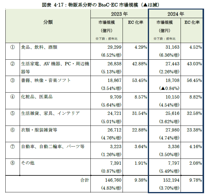 EC市場の拡大は、単なる取引のデジタル化ではなく、消費者のライフスタイルそのものが変化していることの表れです。特に食品・日用品・家電などの「生活密着カテゴリー」がEC化をけん引しており、企業にとってECはもはや「補完チャネル」ではなく「主要販路」の一つとして位置づけられています。
