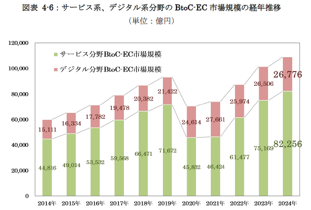 (図表4-6:サービス系・デジタル系分野のBtoC-EC市場規模の経年推移/出典:同調査 p.32)